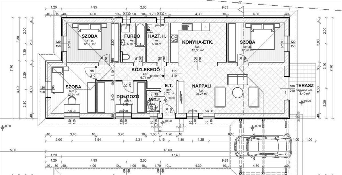 • Fürdőszoba + külön wc, háztartási helyiség, előtér, közlekedő