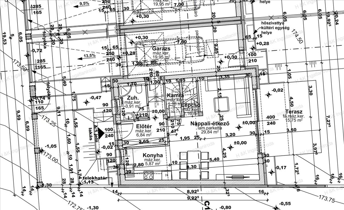 A földszint 69, 72 nm a garázzsal + terasz: amerikai konyhás nappali + fürdőszoba zuhanyzóval + kamra + előtér + terasz
