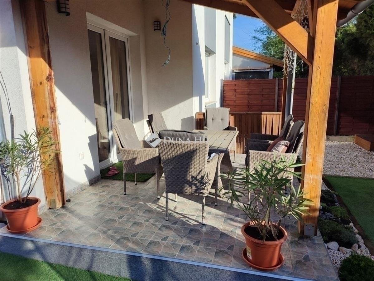 Eladó ikerház FótújfalunEladásra kínálok Fótújfalu egyik csendes utcájában egy 2017-ben épült ikerházat, mely rendkívül jó állapotú egy tisztasági festéssel akár azonnal költözhető. a ház 30-as téglából épült, 15 cm-es hőszigeteléssel, műanyag nyílászárókkal. a fűtést és a meleg víz ellátását kombi gázcirkó biztosítja, az emeleten elhelyezett klíma pedig a teljes szint hűtésére alkalmas. Az ingatlan elő van kábelezve riasztórendszer kiépítéséhez, elektromos kapuval, kerti csappal és egy autó számára térkövezett kocsibeállóval rendelkezik. Az Élettérről: a földszinten, tágas-világos amerikai konyhás nappali (34m2), szoba, fürdőszoba és egy előszoba található. Az emeleten 3 szoba, közlekedő és egy fürdőszoba került kialakításra. a padlástér nem került beépítésre, kiválóan alkalmas elapakolandó dolgainkat elhelyezni. a nappaliból nyílik egy 14m2-es fedett terasz az udvari részre. Az ingatlanhoz tartozik egy 250m-es kert, mely prémium minőségű műfűvel borított így igen alacsony fenntartási költséget von maga után. Az udvar méretéből adódóan kiválóan alkalmas baráti és családi összejövetelekre, ahol nyugodtan kihasználhatjuk a környék adta nyugalmat. a szomszédság kedves és csendes, mely elengedhetetlen egy nyugodt Életvitelhez, jó lakóközösség jellemzi a környéket. a ház elhelyezkedése is verhetetlen: m2, iskola, óvoda, orvosi rendelő, lidl, bevásárlási lehetőségek mind elérhető pár perc autóval. Ajánlom Családosoknak és azoknak akik szeretnének egy nagyon jól megépített ingatlan új Tulajdonosai lenni további költségek nélkül. Bármilyen kérdés esetén keressen bizalommal! Független hitelügyintézésben is tudok segíteni teljesen díjmentesen, sok időt megspórolva! FIX 3% lakáshitelre megvehető