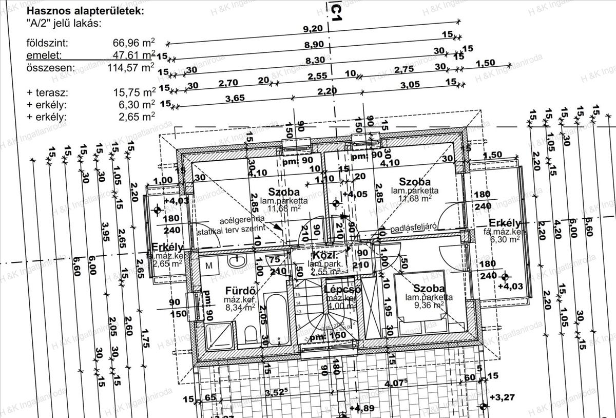 Az emelet 47, 61 nm + 2 erkély: 3 hálószoba (mindegyik erkélykapcsolatos), fürdőszoba káddal, közlekedő, két erkély