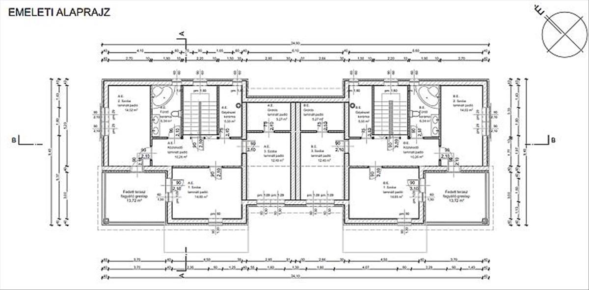 Emelet: 3 db Hálószoba, fürdőszoba, gépészeti helyiség és egy fedett terasz.