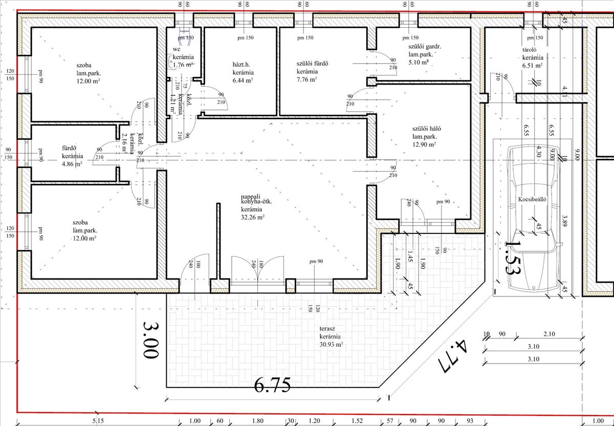- Nappali-konyha-étkező, 3 szoba, gardrób, közlekedő, két fürdőszoba, vendégmosdó, háztartási helyiség + 6, 51nm-es tároló és 30, 93nm-es terasz.