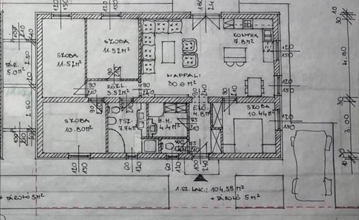 - Előtér, nappali-konyha-étkező, közlekedő, 4 szoba, kádas-zuhanyzós fürdő, mosókonyha/fürdő, külön mellékhelyiség + 5nm tároló + terasz.