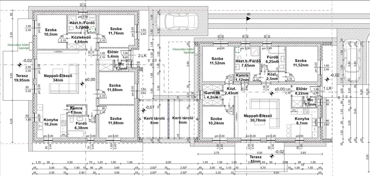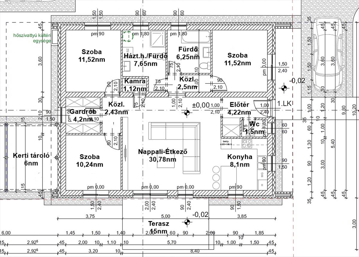 - Előtér, nappali-konyha-étkező, kamra, 3 szoba, gardrób, közlekedő, fürdőszoba, háztartási helyiség/fürdő + 15nm terasz és 6nm tároló.