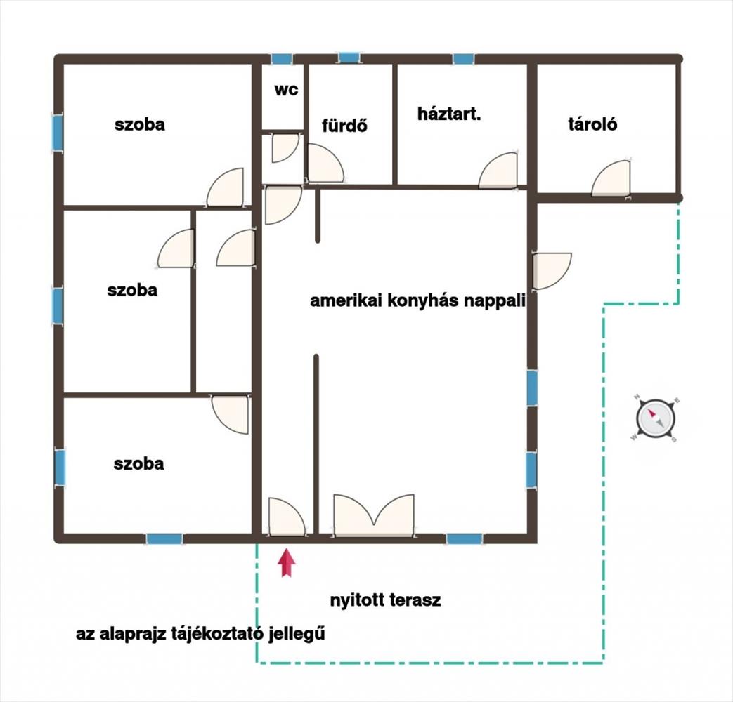 Az elosztás a következő: előtér (10, 8 m²), fürdő (6, 48 m²), wc (1, 76 m²), gardrób (9, 14 m²), háztartási helyiség (7, 76 m²), közlekedő (1, 21 m²), amerikai konyhás nappali (35, 7 m²), három szoba (12 m², 12, 39 m², 10, 26 m²), további wc (1, 76 m²) egy nyitott terasz (21 m²).