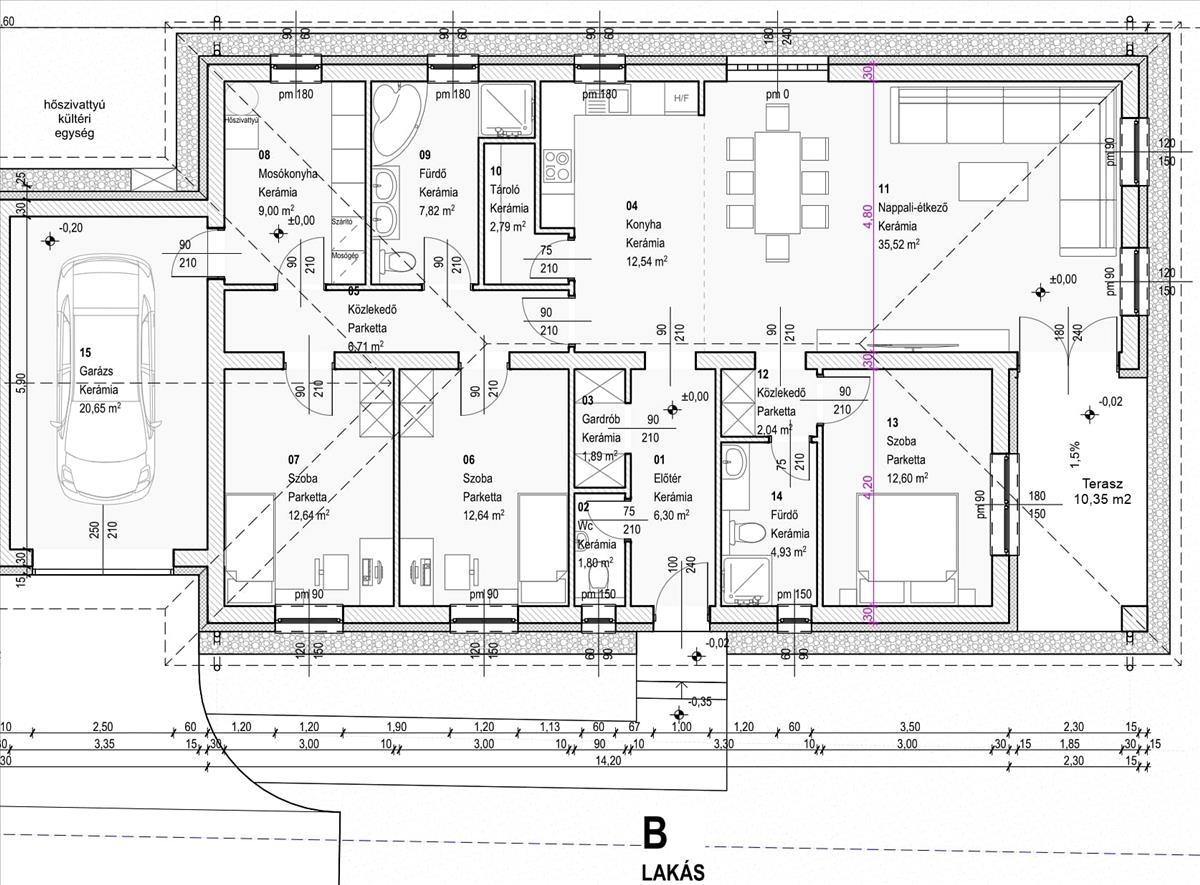 - Előtér, nappali-konyha-étkező, kamra/tároló, 3 szoba, gardrób, közlekedő, két fürdő, vendégmosdó, mosókonyha + 10, 35nm terasz és 21nm-es garázs.