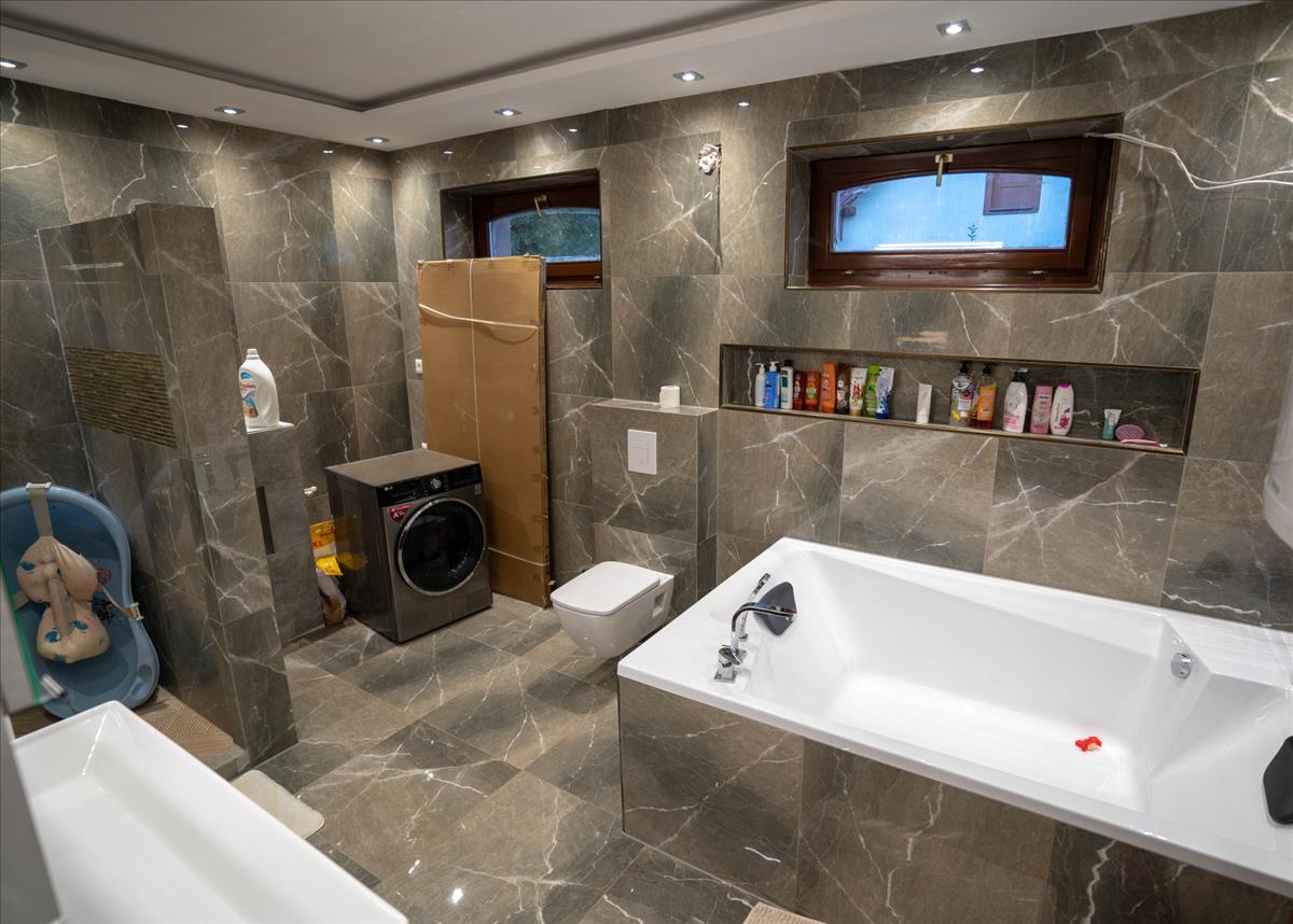 A tágas fürdőszobában kétszemélyes kád és egy épített zuhanykabin is rendelkezése áll, a geberit Wc-k beépített tartályosak, az eredeti fa konyhabútor (gránit mosogatóval, gépekkel) az ár részét képezi.