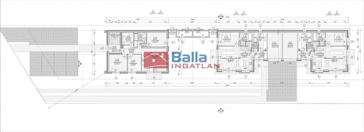 Az ingatlanon 4 családi ház és 4 iroda funkciót betöltő építmény kap helyet. Az irodák: kettő a földszinten, kettő az emeleten helyezkedik el. a lakóegységek kétszintesek lesznek.