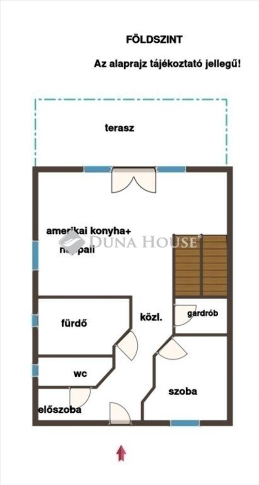 A földszintre belépve 45 nm-es amerikai konyha és nappali fogad Minket, mely teraszkapcsolatos, a 23 nm es fedett terasz, a családi élet színtere lehet.