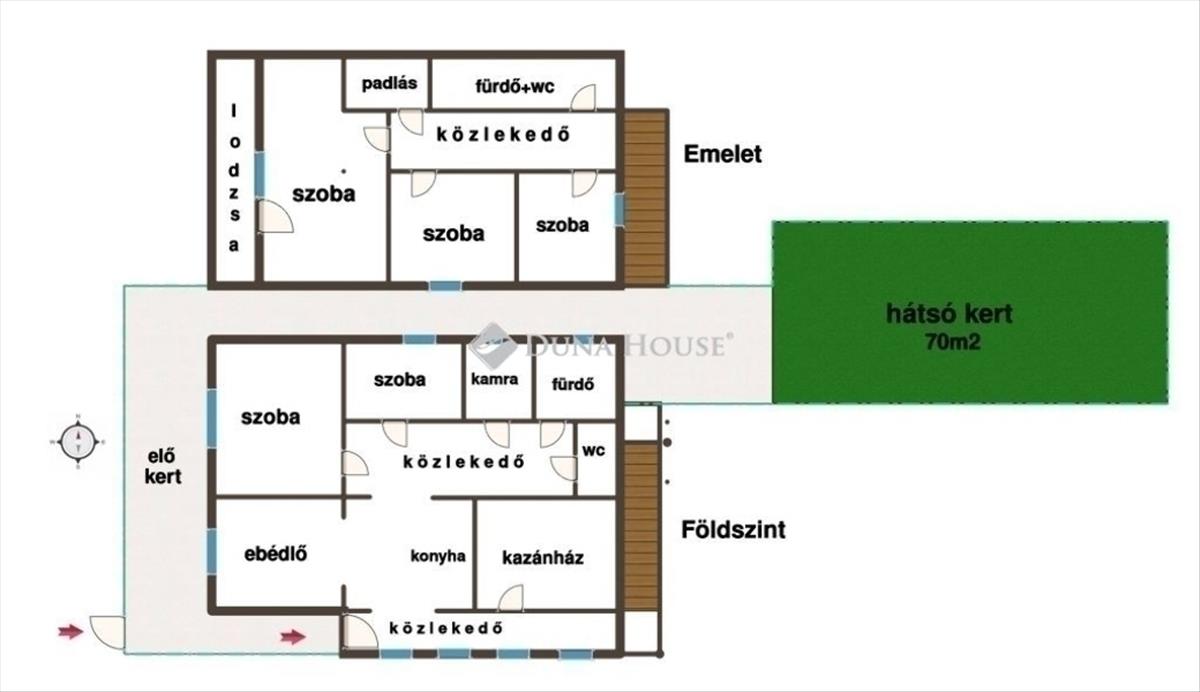 Az ingatlan átmenő forgalomtól mentes, aszfaltozott utcában helyezkedik el. a 661m2-es telekre egymás mögé épült fel az ikerház, mindkét ingatlan kerítéssel elszeparált egymástól és külön bejárattal rendelkeznek. Az ingatlan közepes állapotú, nyílászárói műanyagok. Az alsó szinten egy tágas ebédlő és konyha került kialakításra, 2 szoba, fürdő, wc, kamra. a felső részen 2+1 szoba, füdő+wc került kialakításra. a házhoz az épület háta mögött egy elszeparált, saját, 70m2-es udvar tartozik.