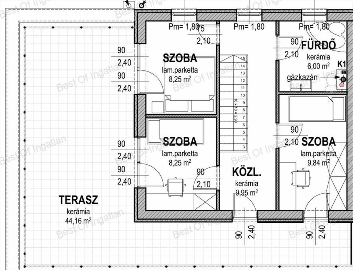 - a felső szinten mindhárom hálószobából megközelíthető a hatalmas 44 m2-es terasz