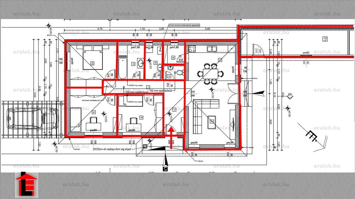 Elrendezése: Előtér, amerikai konyha nappalival, kamra, 3 hálószoba, háztartási helyiség, fürdőszoba WC-vel, külön wc. a házhoz 17 nm -es tárolóhelység kapcsolódik. Ezzel van összekötve a L. 2-Es jelzésű lakóházzal. Tartozik még a lakáshoz egy térkövezett kocsibeálló is /melyet az ár tartalmaz/.