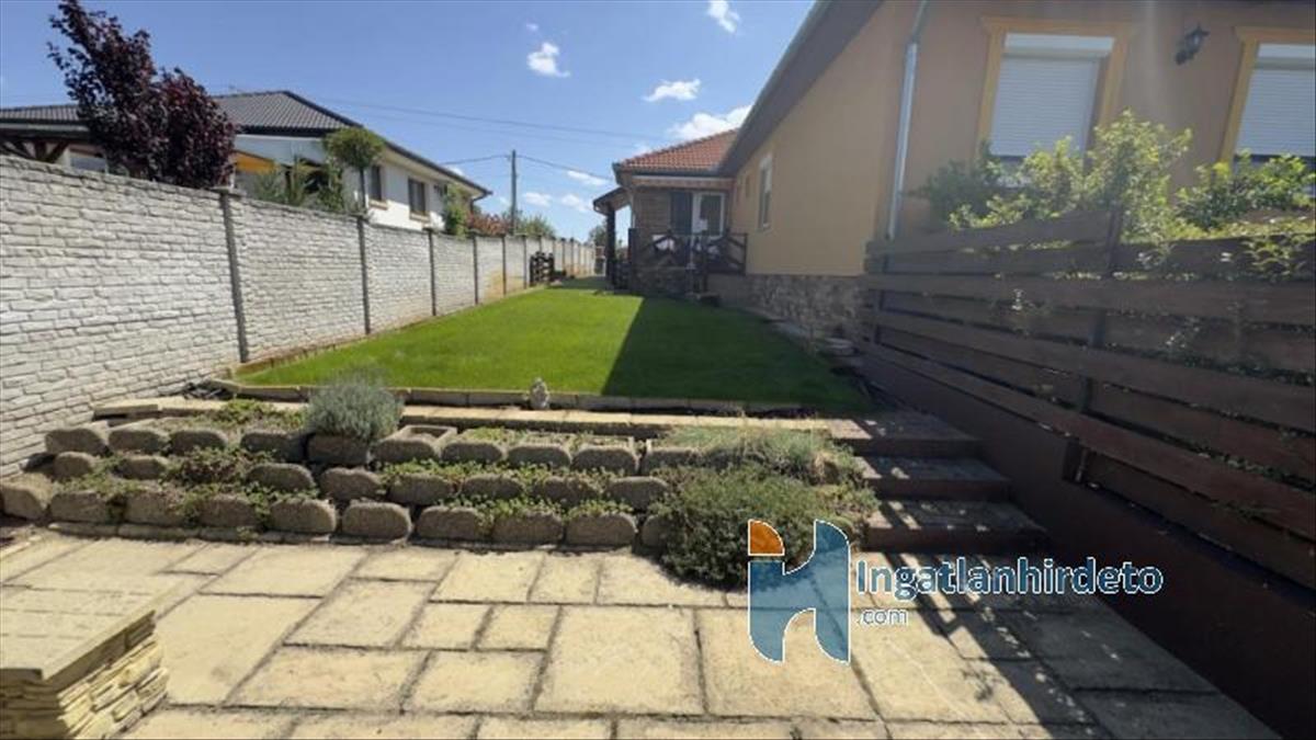 A 16 m²-es garázs közvetlen kapcsolatban áll a lakótérrel, ami a mindennapokban kifejezetten kényelmes. Az udvar rendezett, automata öntözőrendszerrel kialakított, a kertben elkülönített főző- és bográcsozó hely található. Az előkert parkosított, a kerítés jó állapotú.