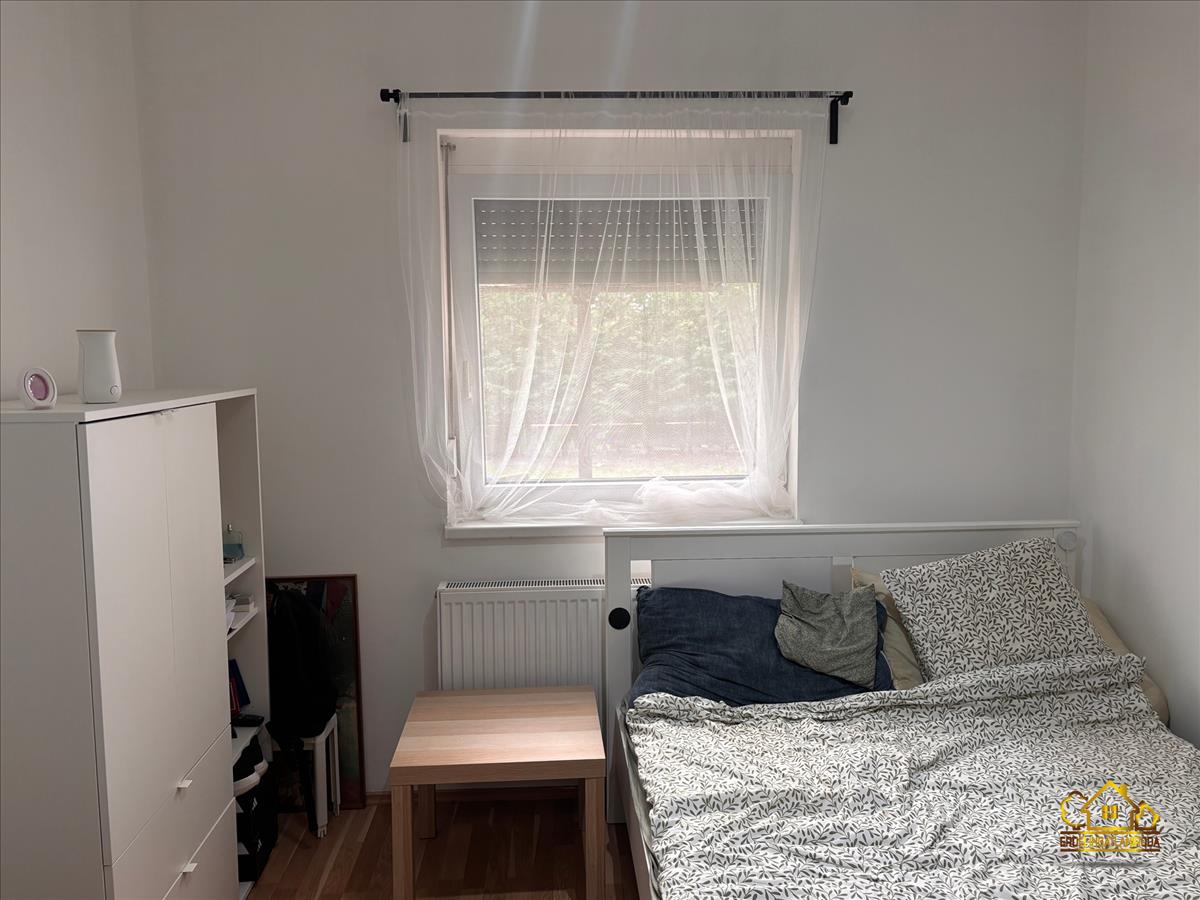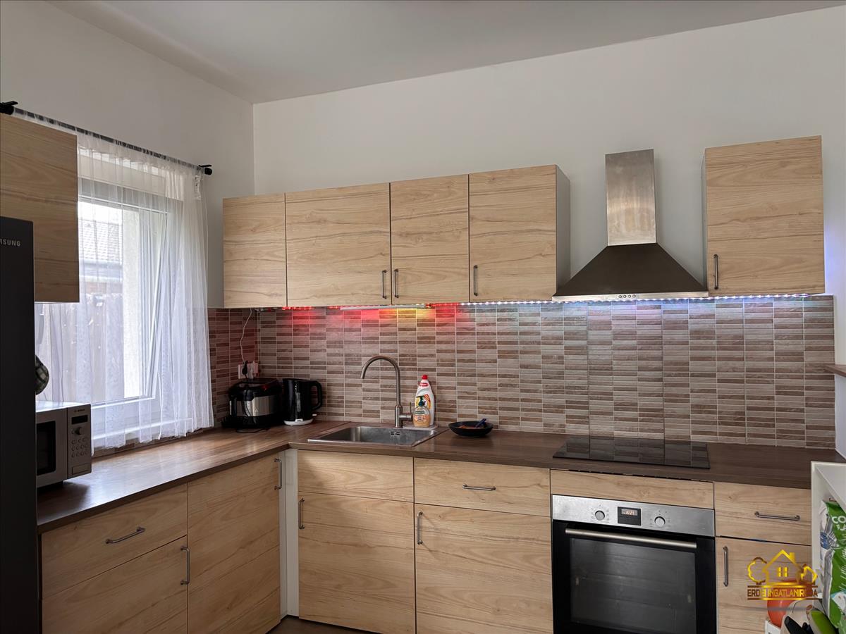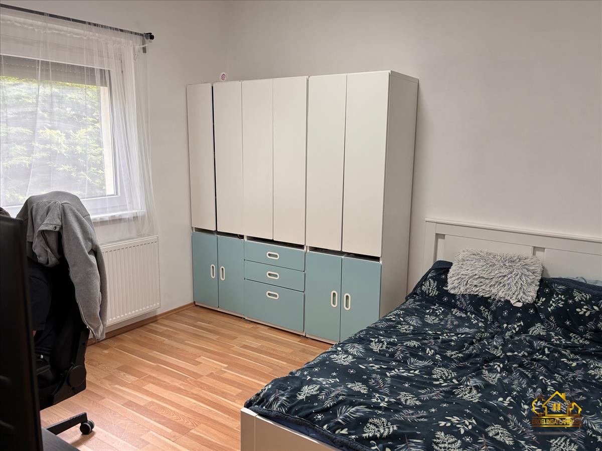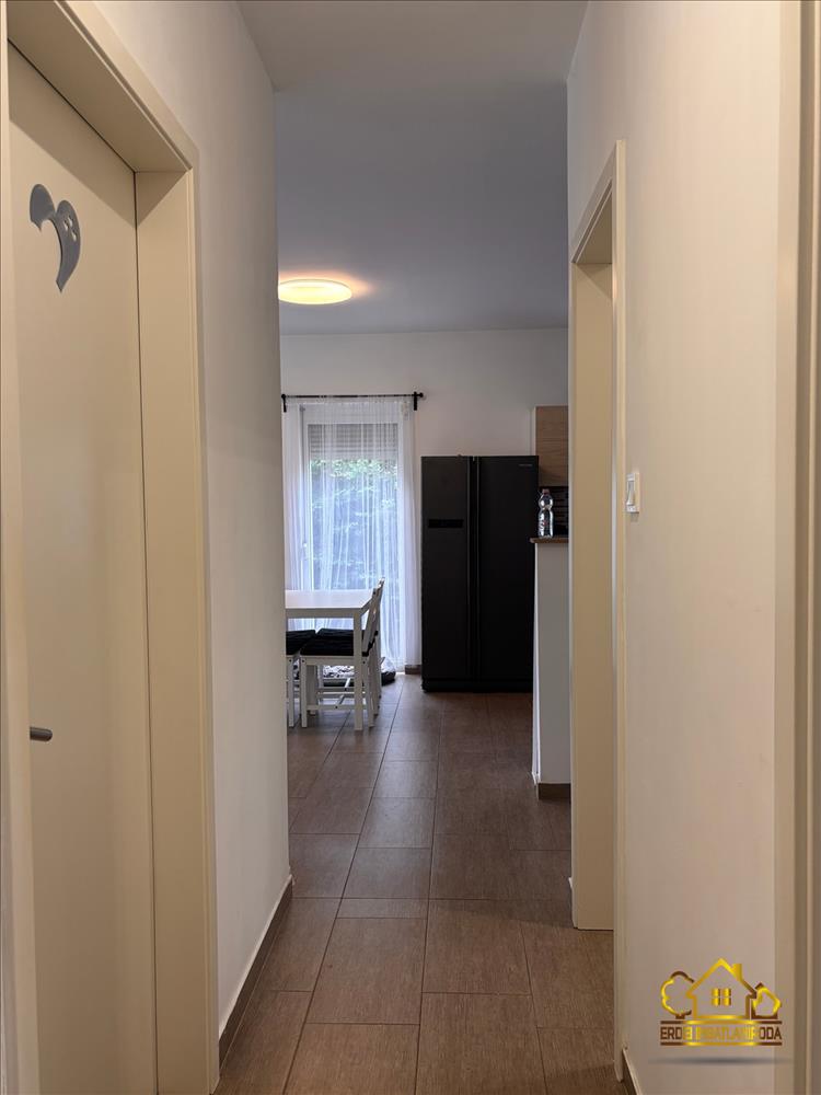 A praktikus elosztású ingatlanban van 3 hálószoba, egy amerikai konyhás nappali beépített konyhabútorral, gépekkel, egy fürdőszoba, egy külön wc helyiség és egy előszoba. a nappaliból a fedett teraszra jutunk ki, ahol a szomszédoktól egy teljesen elszeparált kert található.