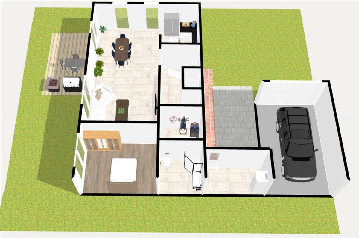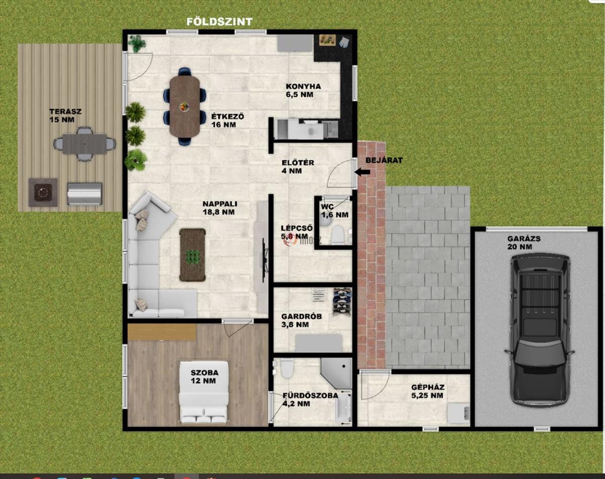 Ezt követi a 20 nm-es garázs, valamint a ház és a garázs között kialakításra kerülő térkövezett, pergolás autóbeálló, amely már az érkezés pillanatában rendezett, igényes benyomást kelt.