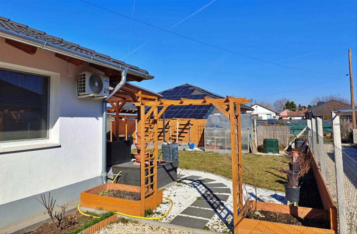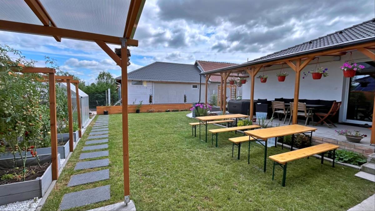 A 450 m²-es, teljesen kiépített telek gondosan megtervezett, ugyanakkor teret hagy az új tulajdonos elképzeléseinek is.