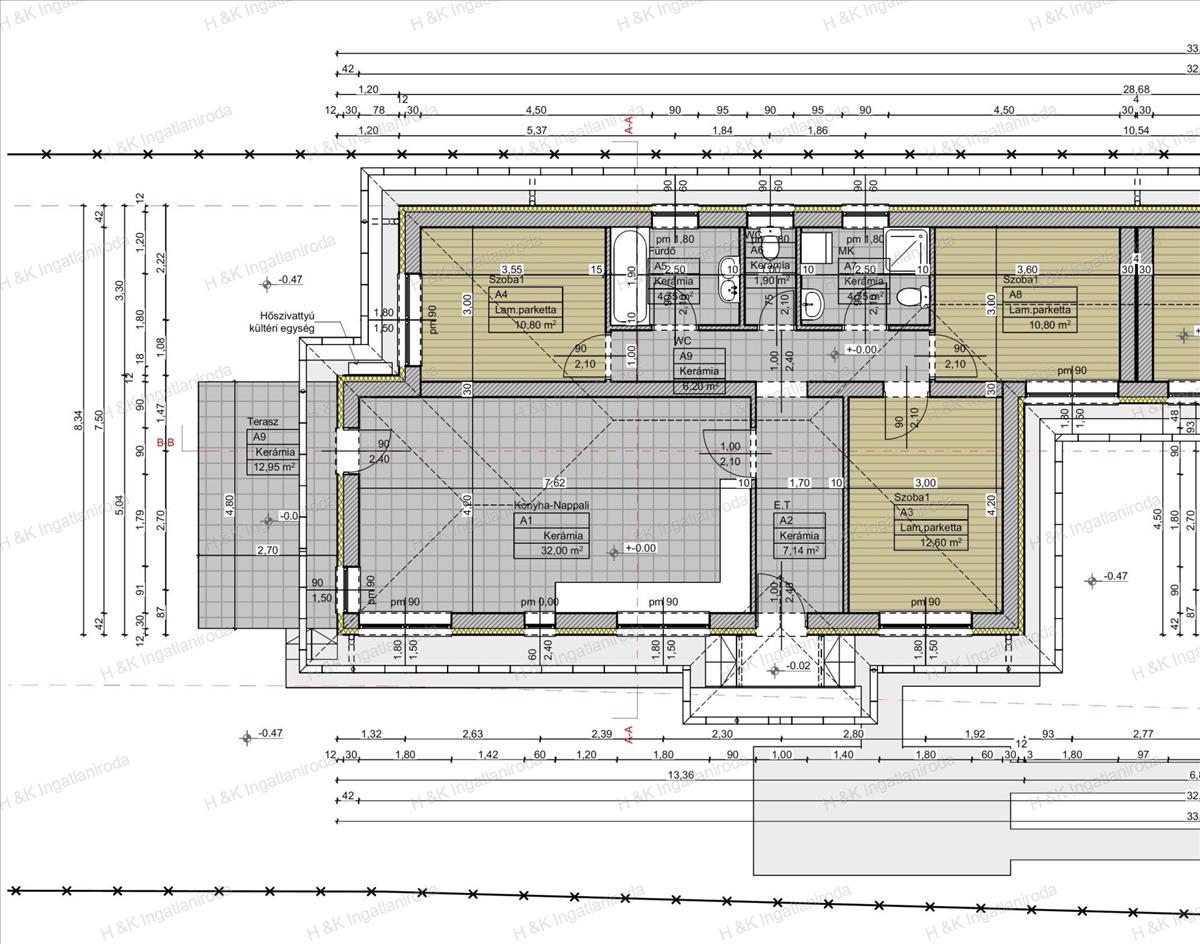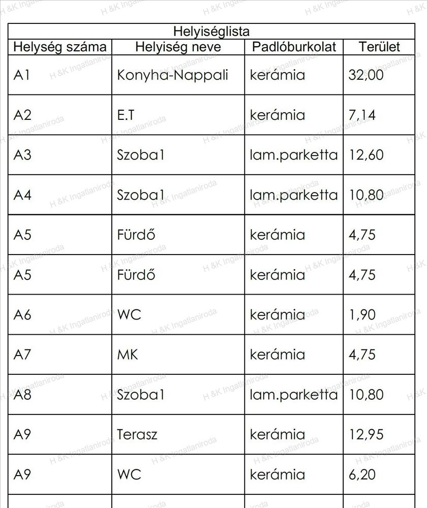 szélfogó 3 nm, előszoba 7, 14 nm, nappali – konyha - étkező 32 nm, 3 szoba 10, 8 - 11, 31 - 12, 6 nm, fürdőszoba 4, 75 nm, háztartási helyiség 4, 75 nm, közlekedő 6, 5 nm, külön wc 1, 9 nm, terasz 12, 95 nm.