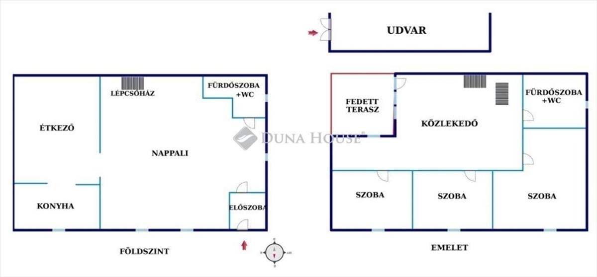 Emelet: közlekedő, 3 szoba, fürdő + wc, fedett terasz
