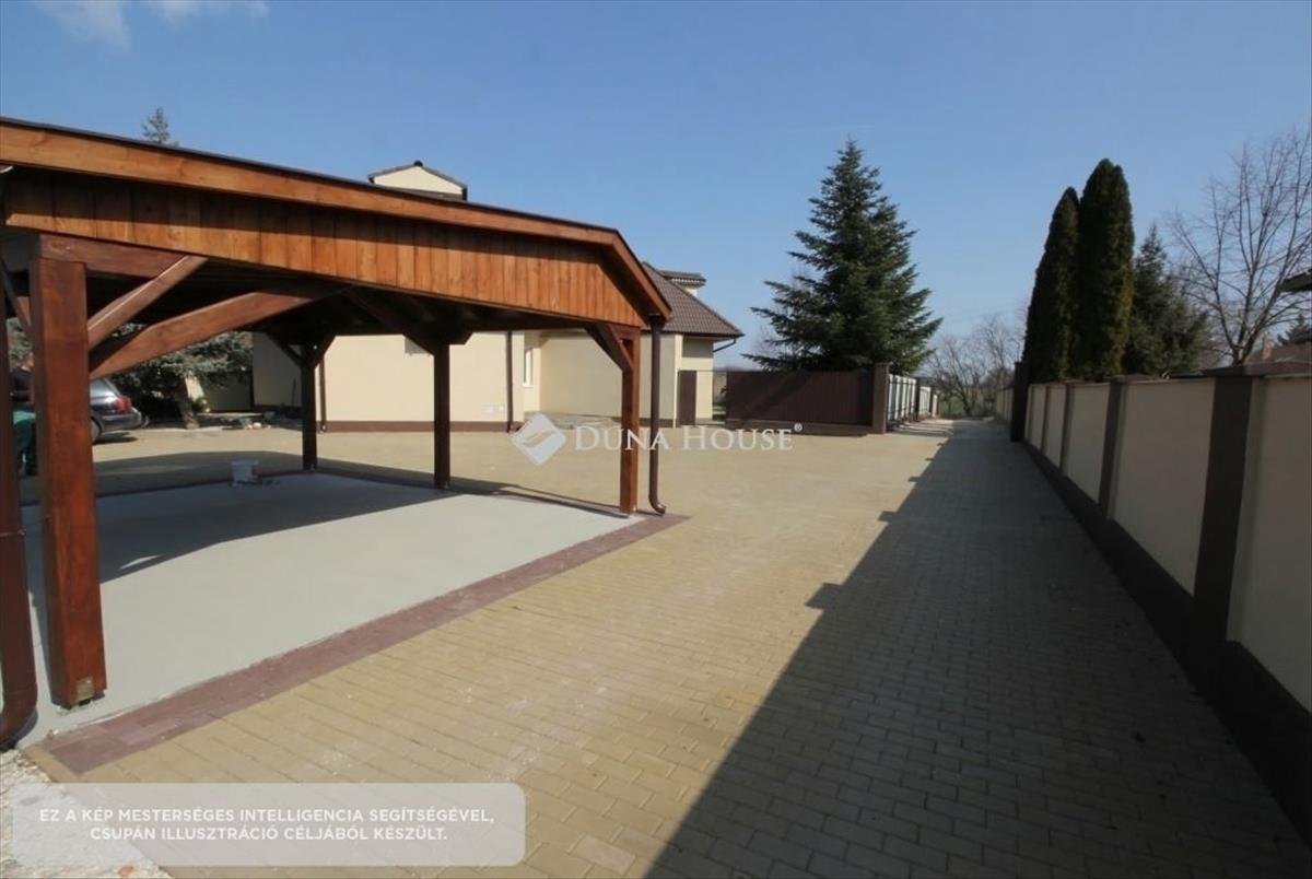 A ház körül több száz négyzetméter térkövezett felület található, valamint dupla fedett autóbeálló is rendelkezésre áll. a telek külön bejárattal rendelkezik, elektromos kapun keresztül közelíthető meg.