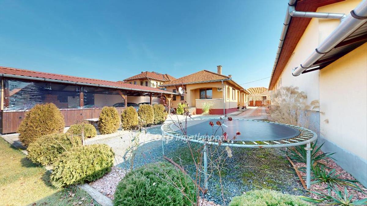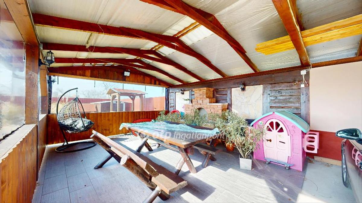 Az 1012 m2-es telken a ház mögött található egy fedett terasz, gépkocsi beálló, füves udvar.