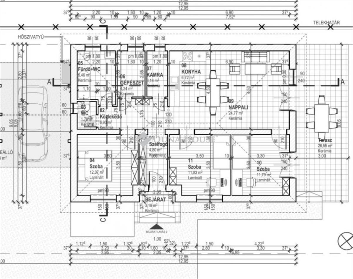 A ház szívét képezi egy 24, 77 négyzetméteres nappali, mely tökéletes helyszín a családi és baráti összejövetelekhez. a nappaliból nyíló 6, 72 négyzetméteres konyha-étkező egyben a kulináris élmények színtere. a ház további részei három kényelmes, egyenként kb. 12 Négyzetméteres hálószoba, egy modern, minden igényt kielégítő 6, 46 négyzetméteres fürdőszoba plusz wc, egy külön wc, valamint praktikus tárolóhelyiségek, mint a gépészeti helyiség és a kamra.