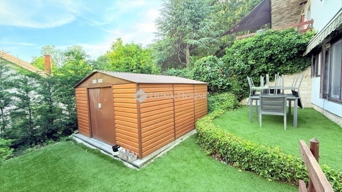 A kert gondozott, változatos növényekkel beültetett, és automata öntözőrendszer gondoskodik a fenntartásáról. a terasz alatt egy pince is található, amely jelenleg a medence gépészetét rejti, de egyéb tárolásra is kiválóan alkalmas.