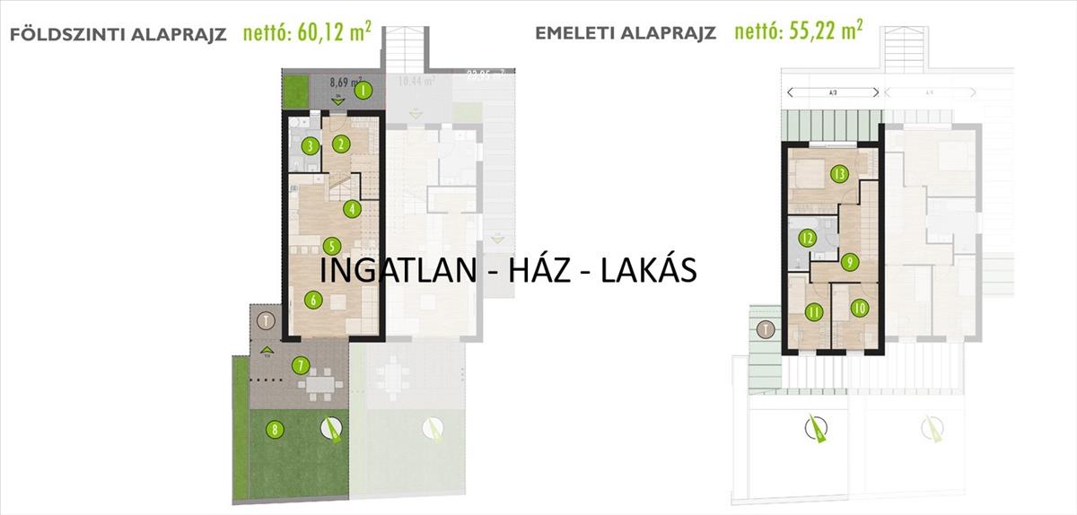 IKERHÁZAK jellemzői: 2 szintes 4 szobás házakat kínálunk, kerttel, terasszal, tárolóval és 2 parkolóhellyel. Bruttó: 140 nm, Nettó: 112 nm lakóterület, Telek: 230-409 nm, Kert: 130-330 nm-ig!