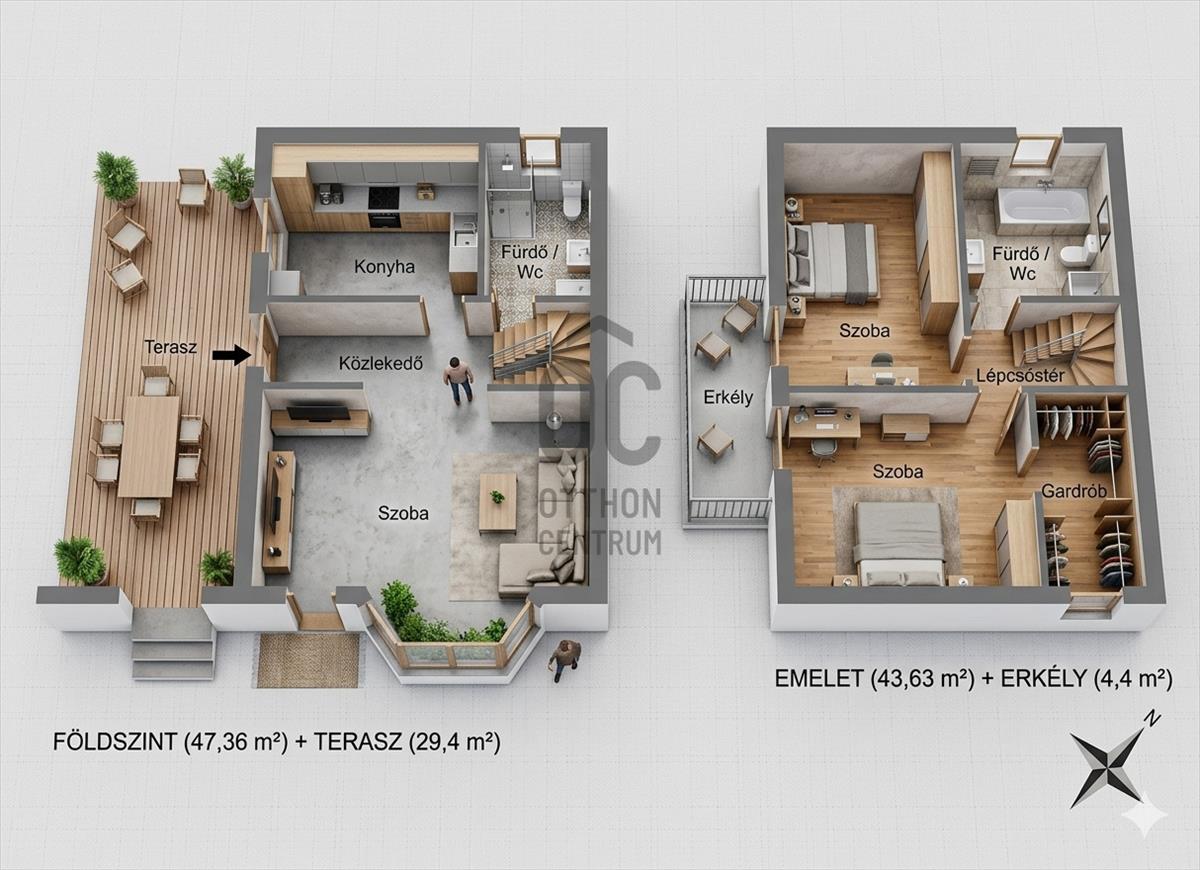Emelet (43, 63 m²): Két teljes értékű hálószoba, egy praktikus gardróbszoba, fürdőszoba és egy panorámás erkély.