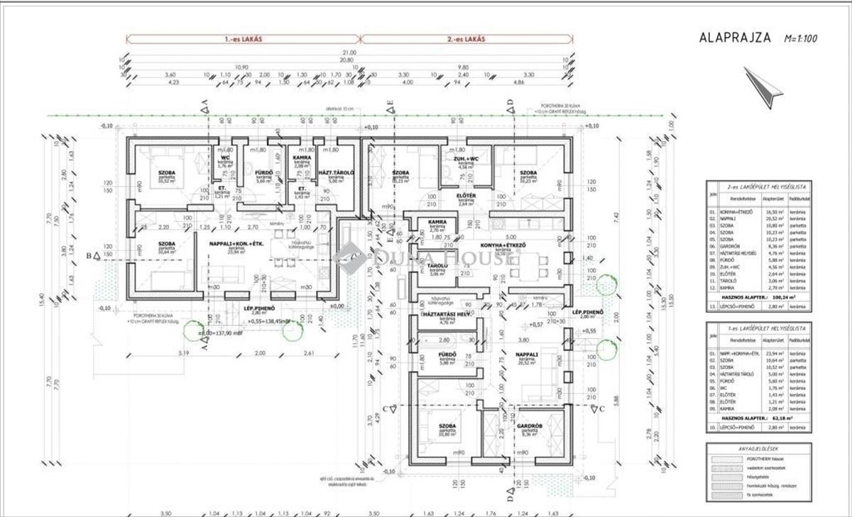 Az ingatlan magas műszaki tartalommal készült. B30-as téglából épült, cserép fedéssel és beton alappal, műanyag nyílászárókkal. a hőszivattyús rendszer gondoskodik a fűtésről és a melegvíz ellátásról, a 30 cm Porotherm fal és 15 cm grafitos hőszigetelés, valamint a háromrétegű ablakok energiatakarékos, alacsony fenntartású otthont biztosítanak. a burkolatok 5. 000 Ft/m² értékig választhatók, így a lakás stílusa személyre szabható.