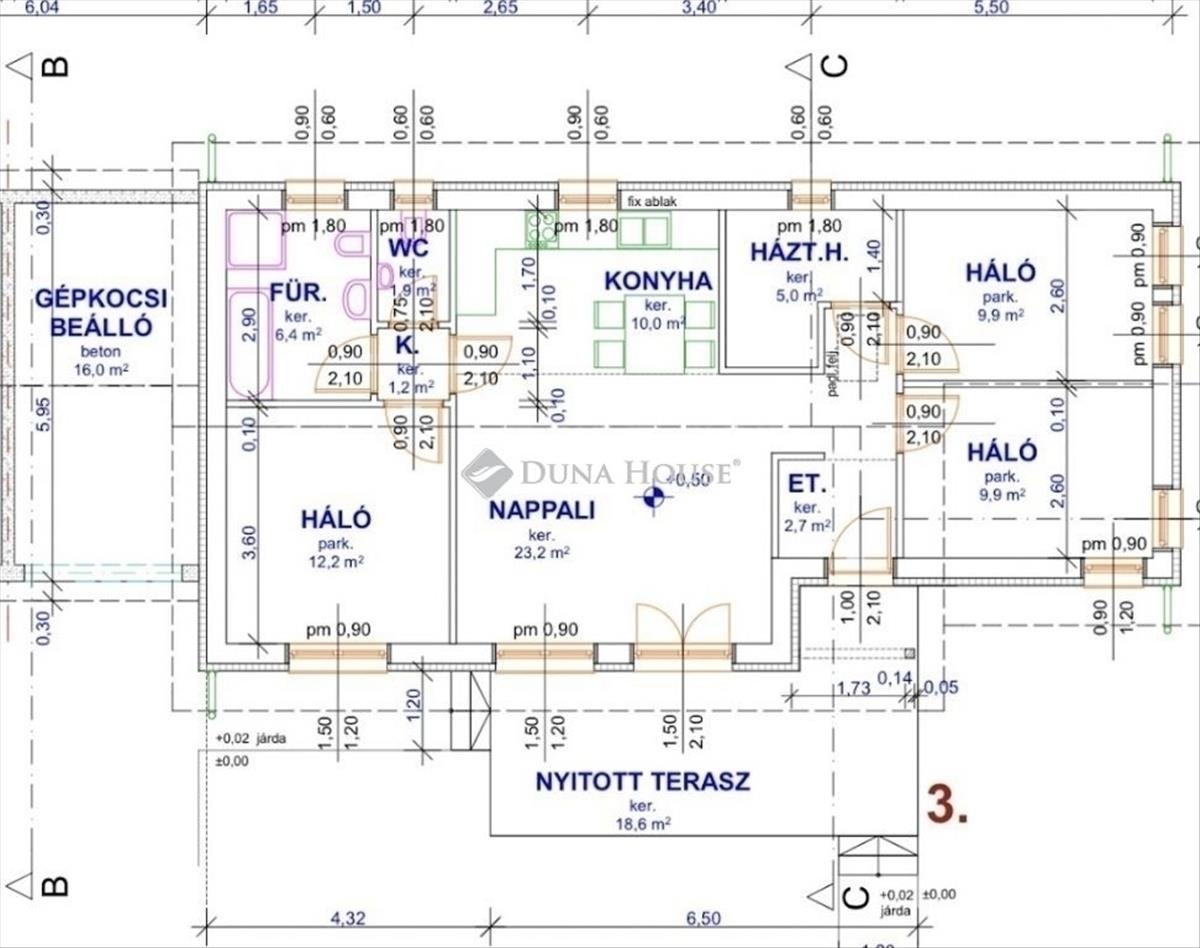 Helyiségeit tekintve nagyon jó elosztással rendelkezik, alábbiakban sorolom fel négyzetméterek megjelölésével:- 3 önálló bejáratú szoba (9. 9 Nm, 9. 9 Nm, 12. 2 Nm)- teraszkapcsolatos nappali (23. 2 Nm)- konyha + étkező (10 nm )- előszoba (2. 7 Nm)- közlekedő (3. 68 Nm)- fürdőszoba (5. 07 Nm)- wc (1. 2 Nm)- háztartási helyiség (5 nm )- garázs (16 nm )- nyitott terasz (18. 6 Nm)