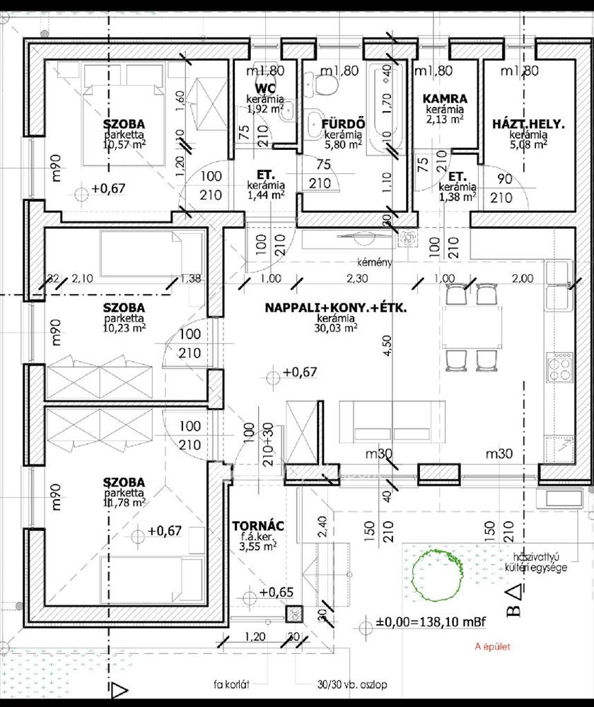 A praktikus alaprajz három hálószobát, egy tágas nappali, étkező, konyha teret, fürdőszobát, külön WC-t, háztartási helyiséget, kamrát és előteret tartalmaz minden adott egy kényelmes, modern otthonhoz. Hideg-meleg burkolatok válaszhatóak 5000 Ft/négyzetméterig.
