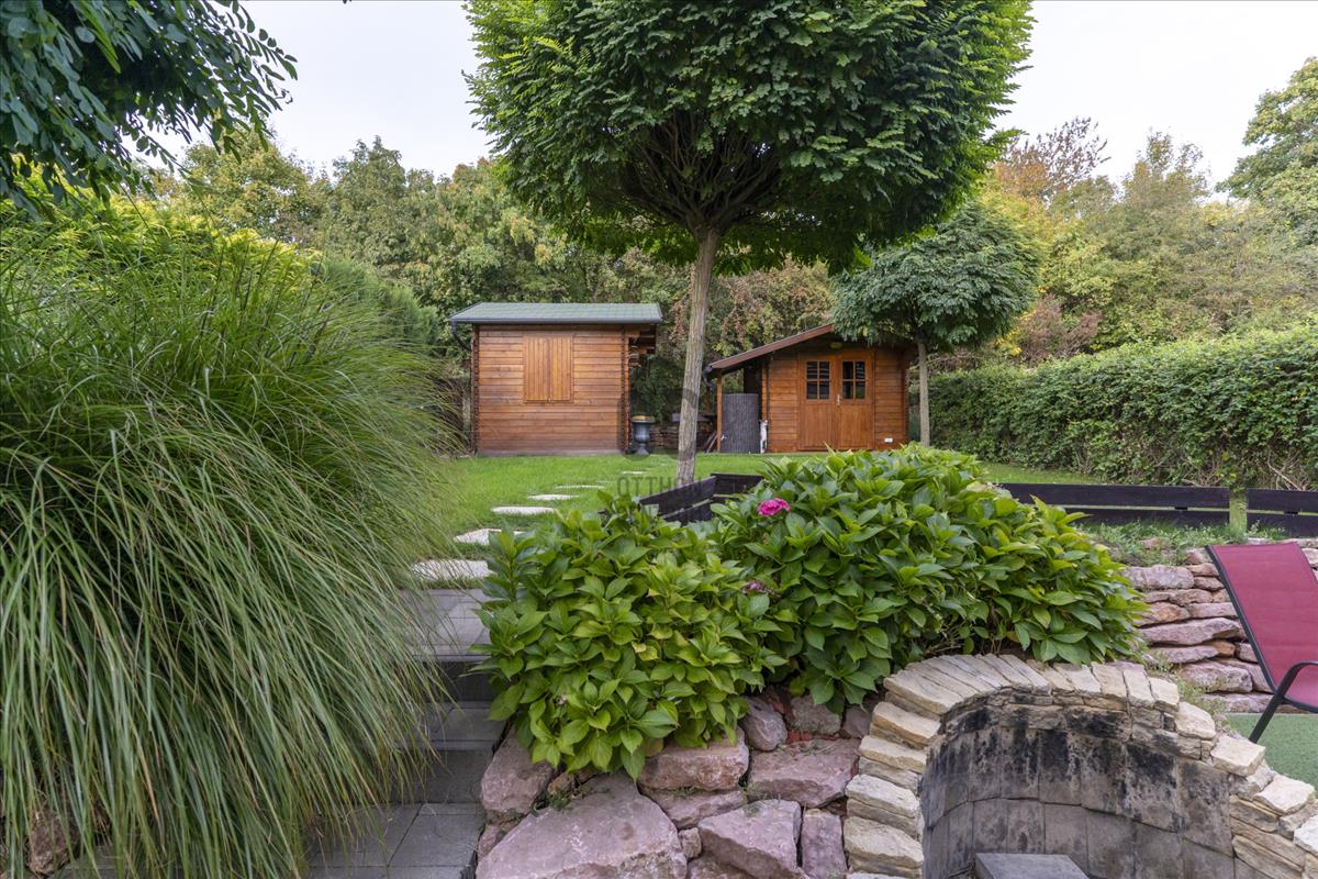 A ház egyik legnagyobb ékessége a gondosan megtervezett és karbantartott kert, amely a tulajdonos igényes munkáját tükrözi.