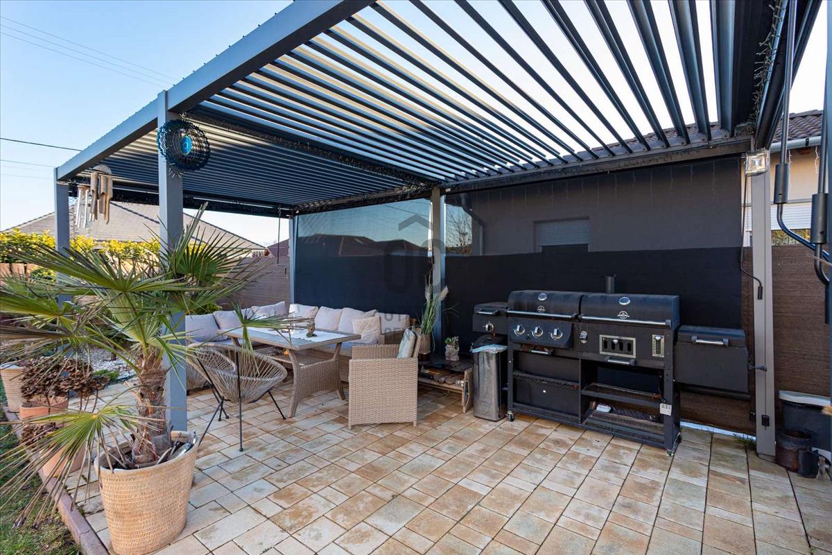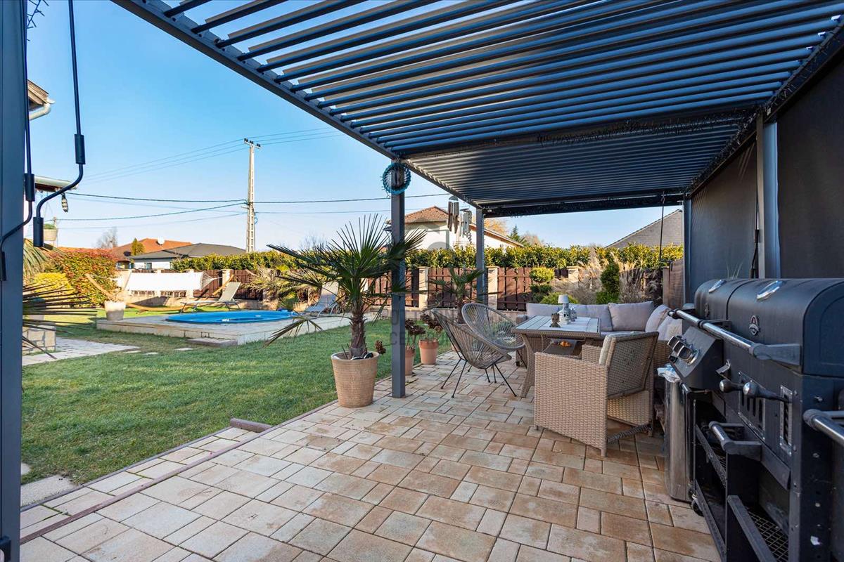 - 18 m2-es bioklimatikus pergola (lamellák mozgatásával szabályozható a fényviszony és a szellőzés, zárt állapotban pedig teljesen vízálló, védve a teraszt az esőtől, hótól és a széltől)