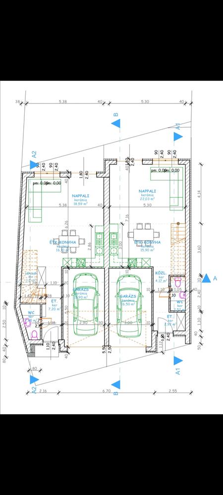 alsó szint 63m2 garázzsal, felső szint 60m2.