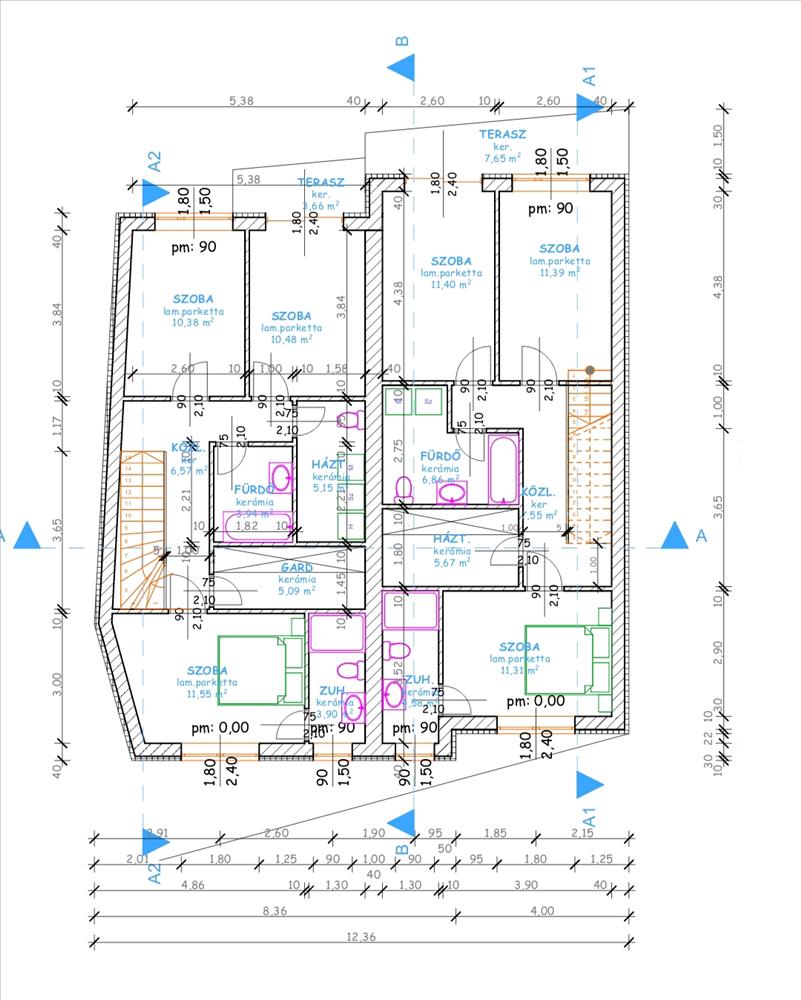 - felső szint: 3 külön nyíló háló, fürdőszoba- káddal, zuhanyzós wc, háztartási helyiség, terasz