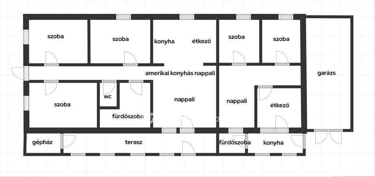Amerikai konyha nappali, három szoba, fürdőszoba, wc, mosókonyha, előtér, gépészeti rész és kamra részekből áll.
