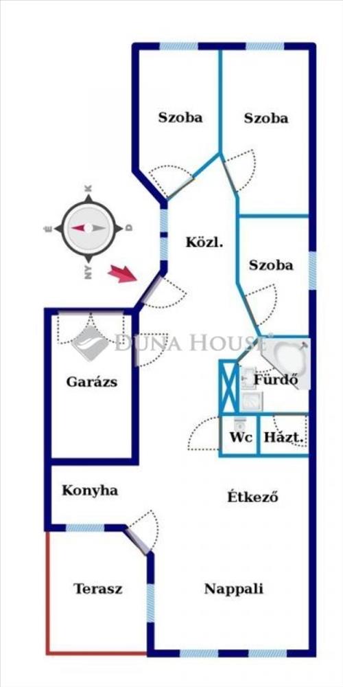 - amerikai konyha + 3 különálló szoba, Fürdő, Wc külön helyiségben, háztartási helyiség, 13, 95 nm-es garázs, 30 nm-es részben fedett terasz,