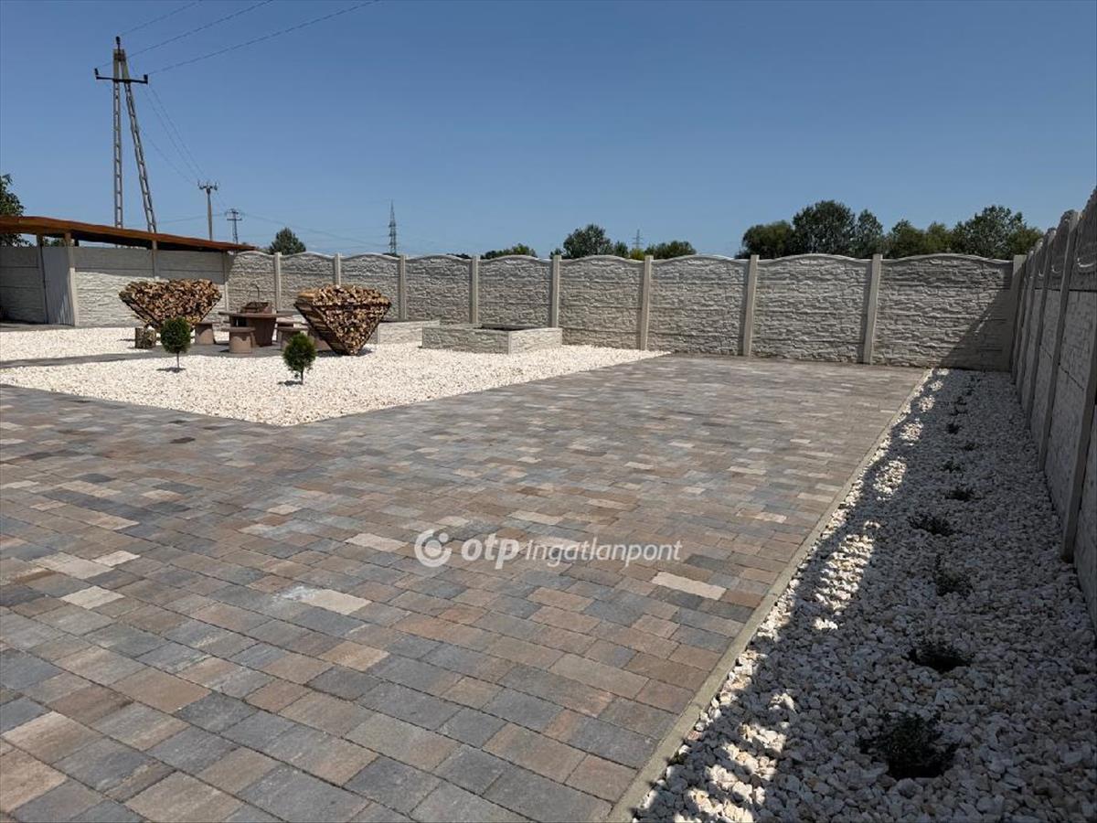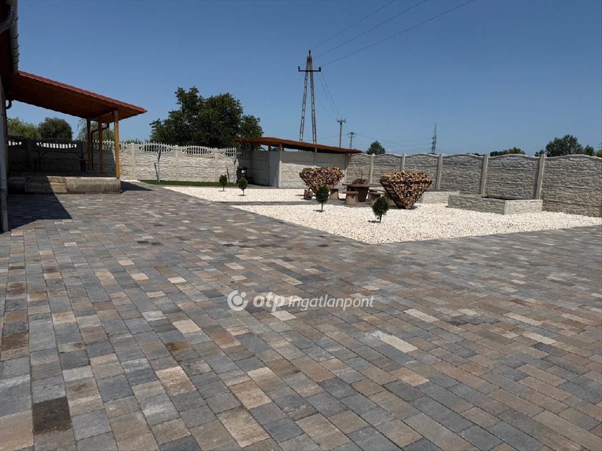 A teljesen körbekerített, beton kerítéses udvar térkövezett és parkosított, rendezett, igényes megjelenéssel.