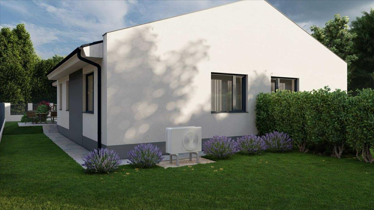 A hőszivattyús padlófűtésre tervezett ház villany, víz és csatorna közművekkel ellátott.