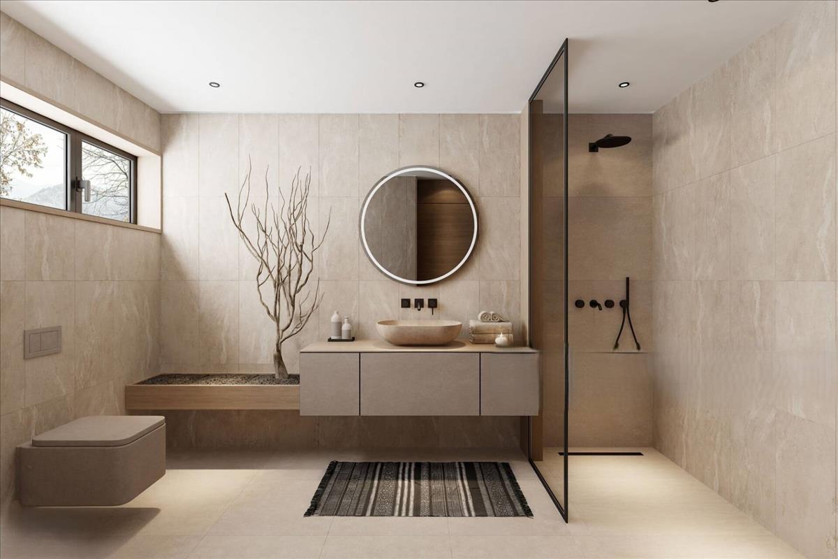 a központi élettér a világos, nagy üvegfelületekkel rendelkező amerikai konyhás nappali, amely közvetlen kapcsolatban áll a teraszokkal és a kerttel.