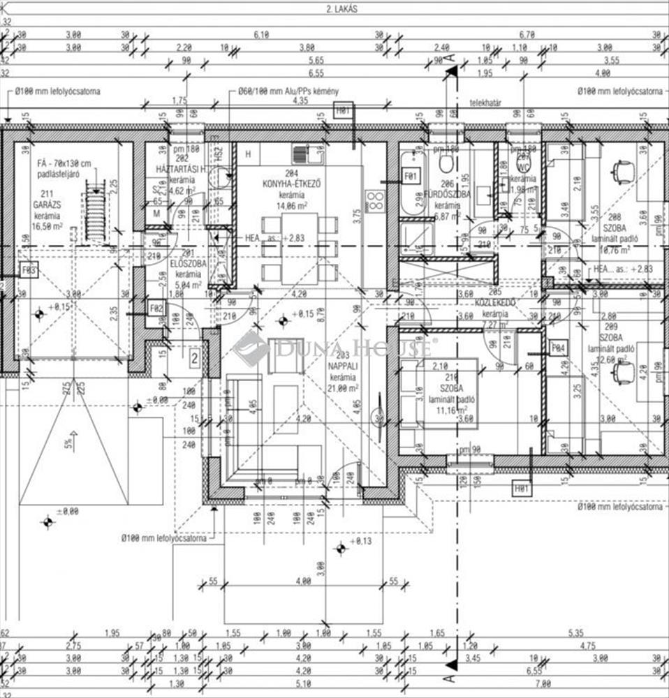 - Lakótér 95, 36 m² + garázs 16, 50 m²- nappali-konyha-étkező, 3 hálószoba, fürdőszoba, wc, mosókonyha, közlekedő, előtér, garázs