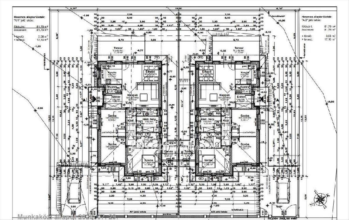 A 734m2-es telken 2 X 81, 79m2-es hasznos alapterületű ház épül, tárolónál összekötve.