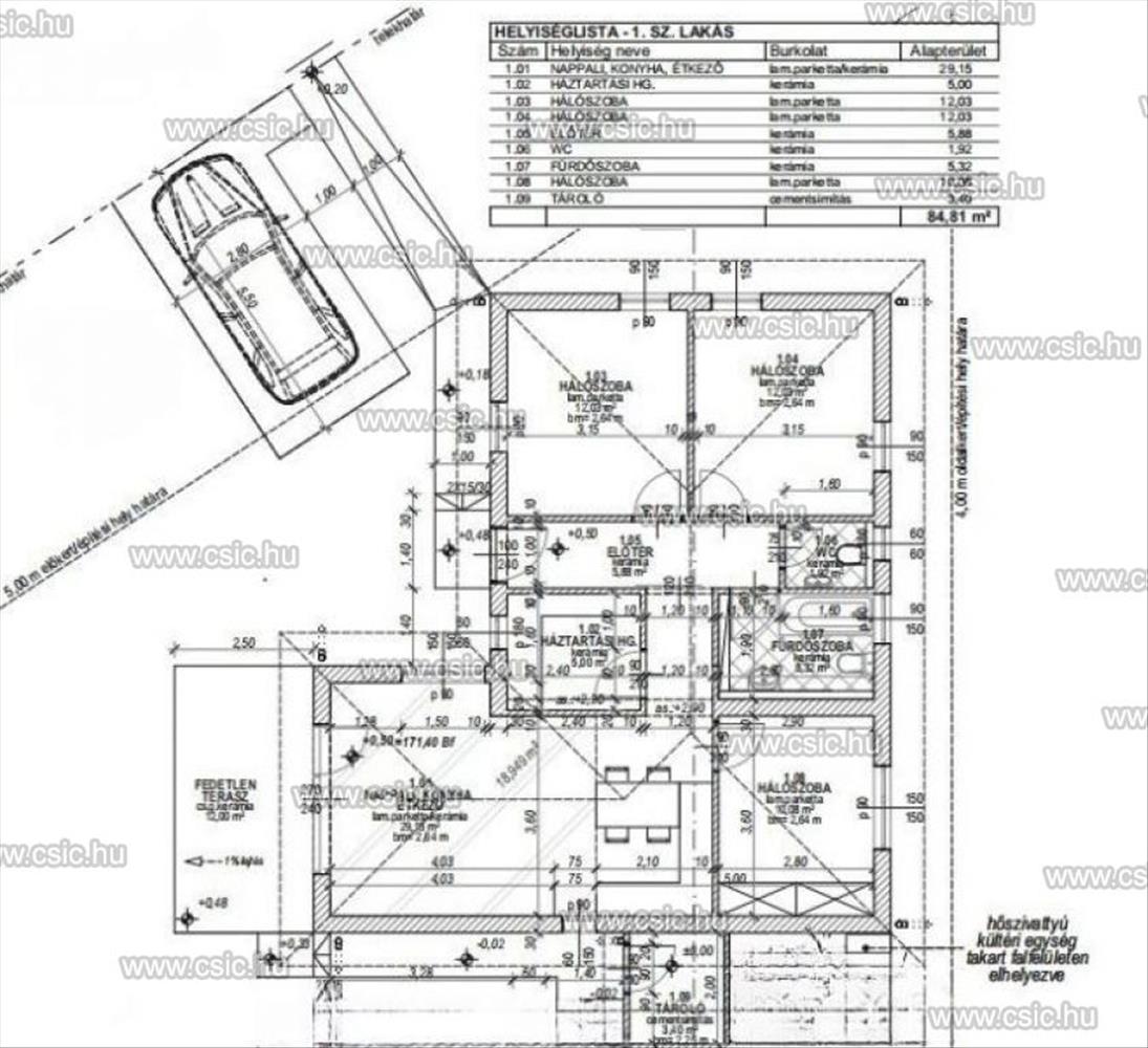 Parkolás: parkolni autóval a telken belül gépkocsinak kialakított, térburkolt beállón megoldott.