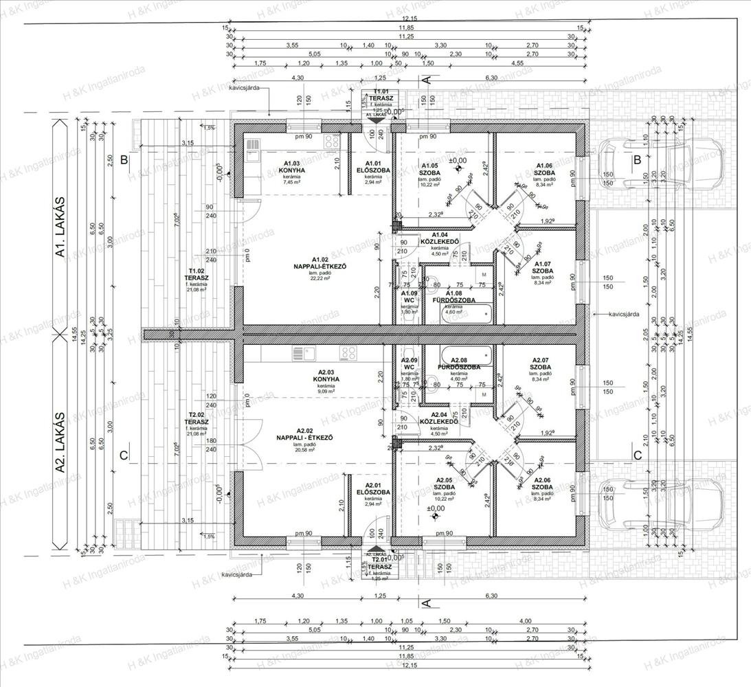 Amerikai konyhás nappali + 3 hálószobás elrendezésű, nettó 70 nm hasznos lakóterületű (+ 22 nm terasz), földszintes, új építésű ikerház bal oldali lakása eladó Őrbottyánban, 500 nm-es saját telekkel.