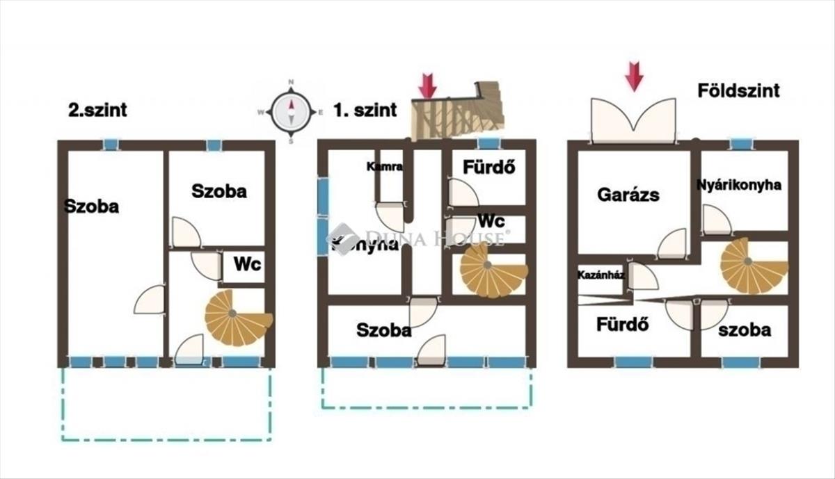* **Alsó szint**: aknás garázs, kazánhelyiség és három további helyiség, melyek szobává alakíthatók.