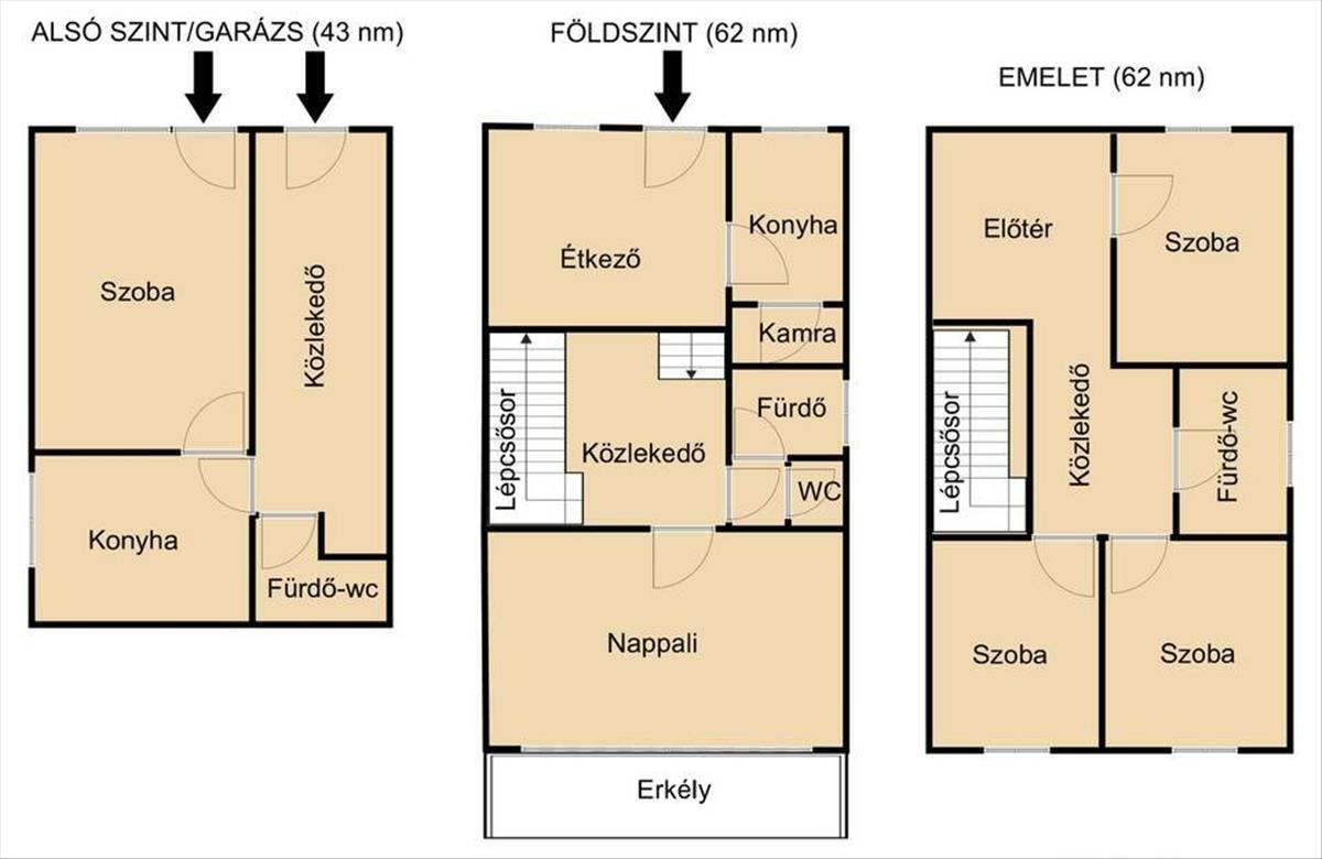 A Földszint (62 nm ), konyha-étkezőből, közlekedőből, nappaliból, fürdőből és külön wc-ből áll. Nappaliból nyílik egy 6 nm -es erkély.
