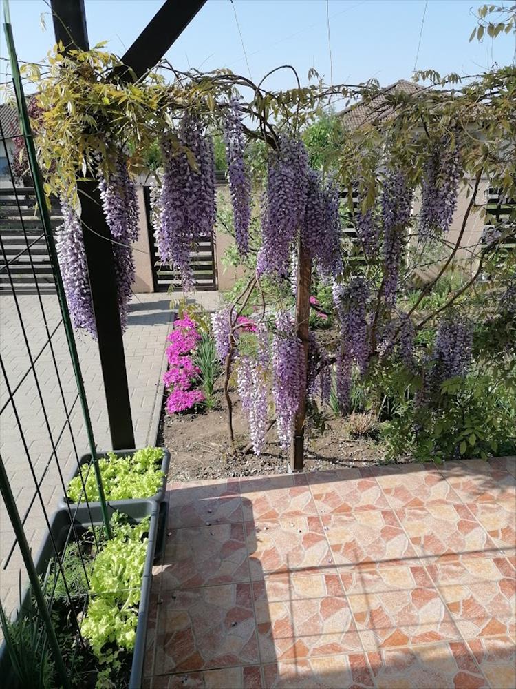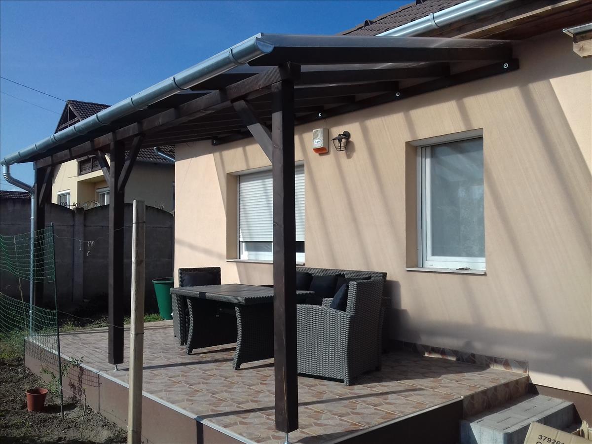 •13 M²-es fedett terasz, térkövezett, fedett kocsibeálló.