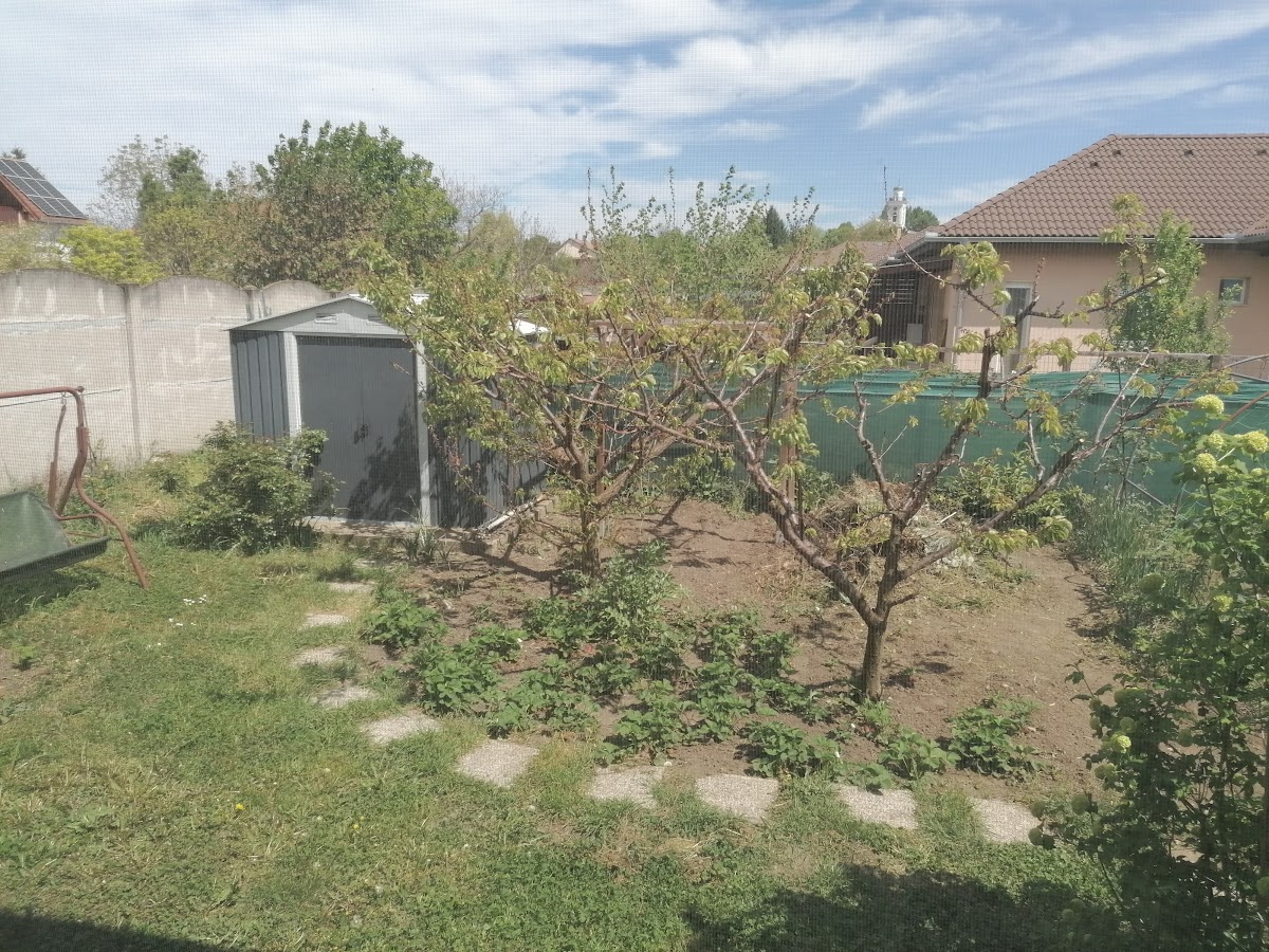 • Kertben gyümölcsfák, kerti tároló.