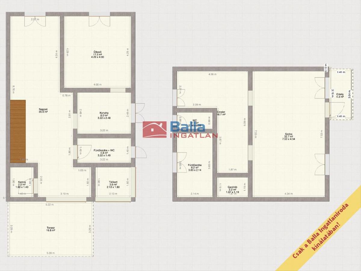A ház elrendezése: Az alsó szintre egy hangulatos, 17 m²-es teraszról léphetünk be, ahol egy tágas előszoba fogad minket. Innen nyílik a világos nappali, az étkező, a praktikusan kialakított konyha és egy kamra. Az emeleten egy hatalmas, 33 m²-es, erkélyes szoba található, amely igény szerint akár két kisebb szobává is alakítható. Ezen a szinten kapott helyet a fürdőszoba, a különálló Wc, egy mosókonyha és egy gardrób is.