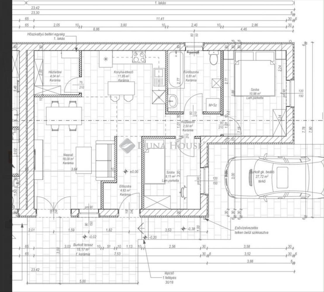 Kialakítása: 2 szoba, tágas amerikai nappali konyha, háztartási helyiség, előtér, közlekedő, fürdő+wc, nyitott terasz.